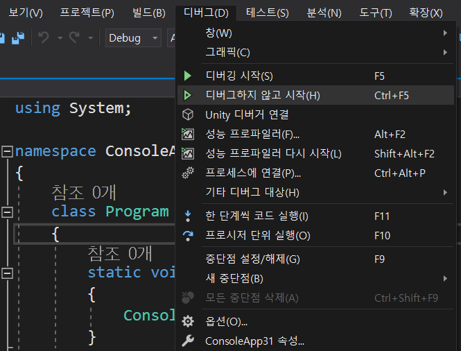 디버그 - 디버그하지 않고 시작 (단축기 Ctrl+F5)