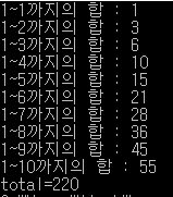 cout << 1 << "~" << j << "까지의 합 : " << sum << endl;