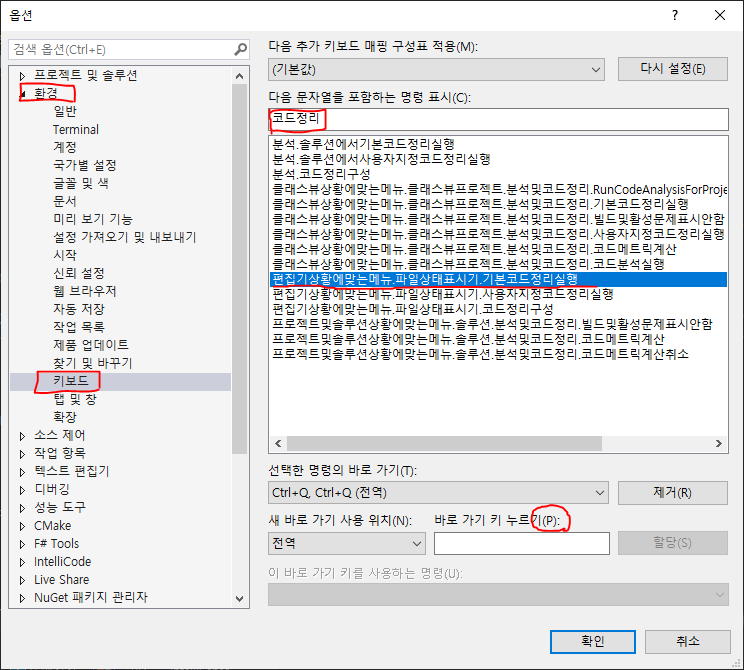 도구 - 설정 - 환경 - 키보드 - 코드 정리 입력 - 바로 가기 키 누르기를 한 다음에